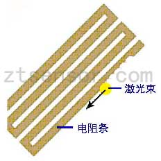 通過薄膜補償電阻網絡的組合,可以將傳感器的零點控制在±2000μV范圍內,但傳感器的零點輸出要求滿足±500μV要求。而且傳感器經過高低溫、加載疲勞、長期的零點時漂后,還要保證輸出在±500μV內,這需要在傳感器的裝配、調試過程中反復補償。僅通過電阻組合或外并電阻補償,工藝調試量大,也很難準確到位。在本項目中,加入了先進的激光調阻工藝,對電阻條的阻值進行修正。激光調阻示意圖如圖2。