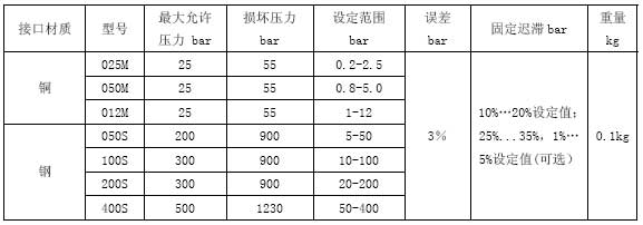 可調(diào)機械壓力開關(guān)內(nèi)置活塞與精密彈簧相連,當壓力變化時,彈簧伸縮量發(fā)生相應(yīng)變化,當壓力達到設(shè)定值時,會觸發(fā)預(yù)設(shè)的機械結(jié)構(gòu)并發(fā)出開關(guān)信號。產(chǎn)品結(jié)構(gòu)緊湊,采用DIN標準插頭,接線極其方便,測量范圍廣(0...400bar),過載能力高(可高達:1230 bar),高重復(fù)性,具有常開或常閉觸點,接點鍍金, 觸點容量大。可用于:水、油、氣體壓力的測量。