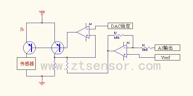 圖中A2的輸出隨A3輸出增大而減小,使A4控制的電流源基準電流增大,從而使傳感器的激勵電流增大,形成一個部分由輸出控制的壓控電流源。改變反饋參數,可校正不同的非線性誤差。