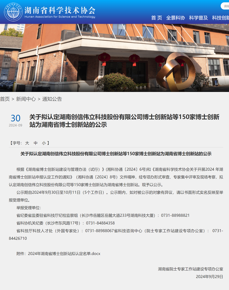 根據(jù)《湖南省科學(xué)技術(shù)廳 湖南省科學(xué)技術(shù)協(xié)會(huì)關(guān)于印發(fā)<湖南省博士創(chuàng)新站建設(shè)與管理辦法>的通知》(湘科協(xié)通〔2024〕54號(hào))和《湖南省科學(xué)技術(shù)協(xié)會(huì)關(guān)于開展 2024 年湖南省博士創(chuàng)新站申報(bào)認(rèn)定工作的通知》(湘科協(xié)通〔2024〕8 號(hào))文件精神,經(jīng)專項(xiàng)辦形式審查、專家集中評(píng)審及現(xiàn)場(chǎng)考察和社會(huì)公示等環(huán)節(jié),現(xiàn)認(rèn)定湖南創(chuàng)信偉立科技股份有限公司等 150 家單位為湖南省博士創(chuàng)新站。 希望各建站單位遵照“五個(gè)一”建站標(biāo)準(zhǔn),充分發(fā)揮進(jìn)站博士團(tuán)隊(duì)的帶動(dòng)作用,在技術(shù)研發(fā)、項(xiàng)目攻關(guān)、人才培養(yǎng)、決策咨詢等方面取得實(shí)效,成為引領(lǐng)創(chuàng)新發(fā)展的平臺(tái)、培養(yǎng)高層次人才的基地和促進(jìn)科技成果轉(zhuǎn)化的孵化器,為加快實(shí)現(xiàn)“三高四新”美好藍(lán)圖作出新的更大貢獻(xiàn)。