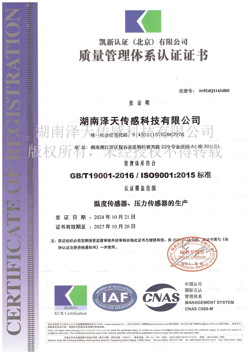 湖南澤天傳感科技有限公司順利通過ISO9001:2015質量管理體系認證,標志著湖南澤天傳感在傳感器生產過程的質量管理獲得了認證機構的認可,同時也進一步驗證了澤天傳感在產品品質管理的規范化和標準化過程中取得的成績。