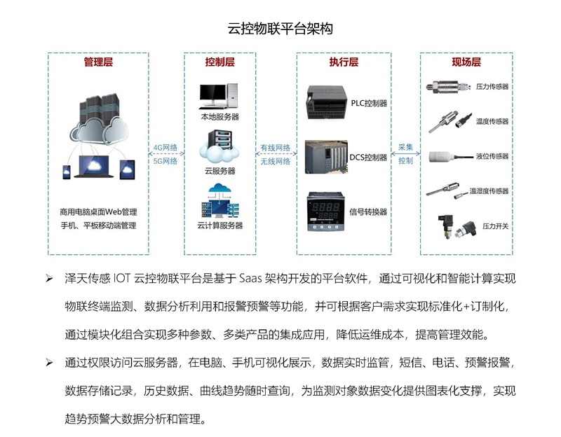 湖南澤天傳感研制的傳感器具有高精度、高靈敏度、高可靠性等特點,已廣泛應用于工業控制、工程機械、化工冶金、能源生產、環保監測、食品醫療、航空航天等領域。澤天傳感研發的新一代智能傳感測控技術,已正式應用在基于物聯網傳感技術的云控物聯解決方案中,本方案設計為管控層、執行層、現場層三級架構,利用物聯網和互聯網技術,通過現場層的高性能傳感器實時監測各種物理量,經過控制層利用無線傳輸技術將數據實時傳輸到云端,再利用大量監測數據進行趨勢預測計算,實現多種參數、多類產品的集成應用,降低運維成本,提高管理效能,為自動化控制、智能化生產等提供了有力支持。