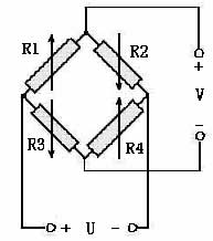 硅壓阻式和合金薄膜壓力傳感器采用的轉換電路一般為全橋應變電路,測量原理見圖1示: