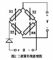 如圖2示:將二極管串接入橋路的供壓電源端來實現靈敏度溫漂的補償;其原理是:對橋路采用恒壓源供電,二極管在正向使用時相當于負溫度系數的小電阻,當環境溫度增加,二極管正向電阻值減小,二極管的分壓減小,橋路的供橋電壓增加,使得傳感器的零點輸出與滿量程輸出增加,從而達到補償硅傳感器的負靈敏度溫漂。這種方法簡單實用,適應于硅壓阻式傳感器的靈敏度溫漂補償;缺點是二極管補償方式離散性大,不能實現連續補償。